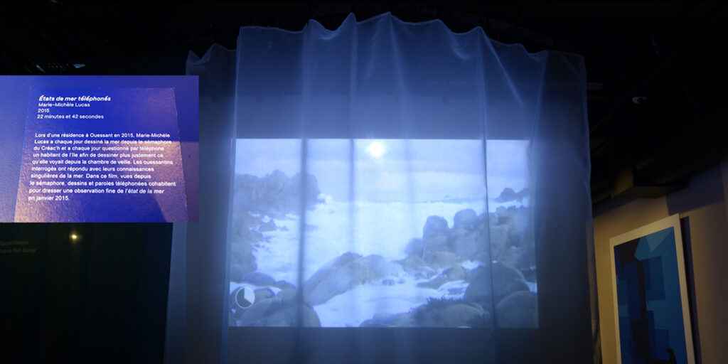 L e film états de mer téléphonés est composé de vues de mer et de dessins. Chaque jour après avoir téléphoné à un.e ouessantin.e au sujet de l’état de la mer, je réalisais un dessin « éclairé (par les échanges) »qui restituait ce que l’on voyait depuis la chambre de veille du sémaphore du Créach. La bande-son du film correspond à un montage de ces enquêtes téléphoniques qui m’auront permis de questionner marin, ancien guetteur-sémaphoriste ou gardien de phare … Ci-dessus, l’installation de 2017 au musée des Beaux-Arts de Brest qui déploie l’ensemble des éléments de la pièce: 16 dessins, la vidéo et des postes avec casques pour l’écoute des 4 sons.